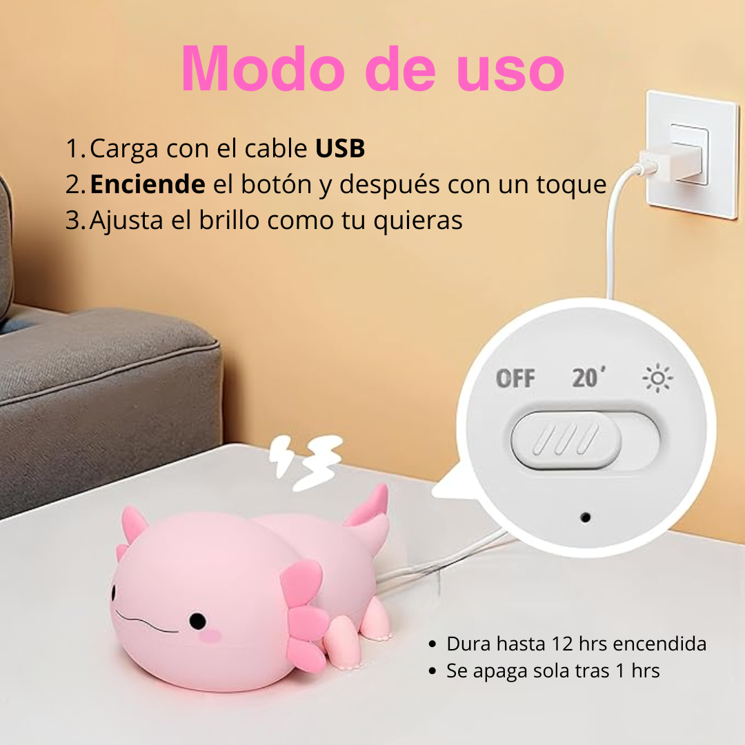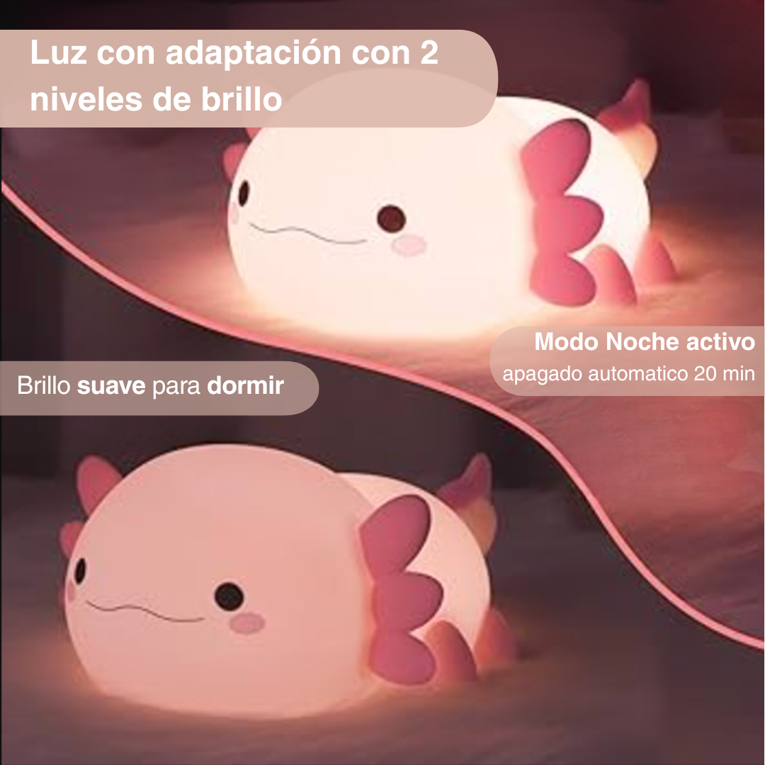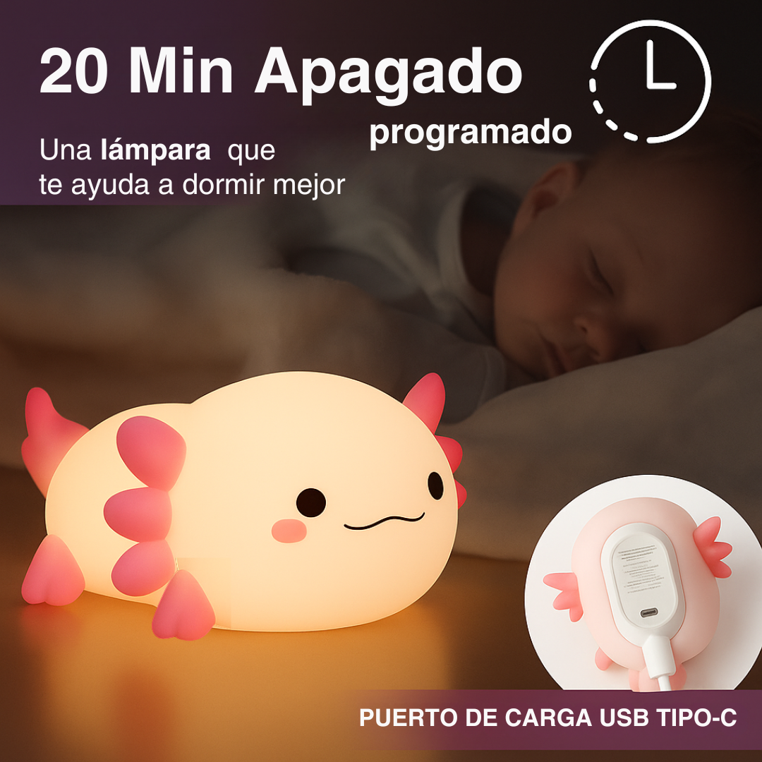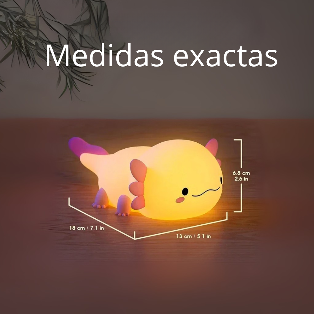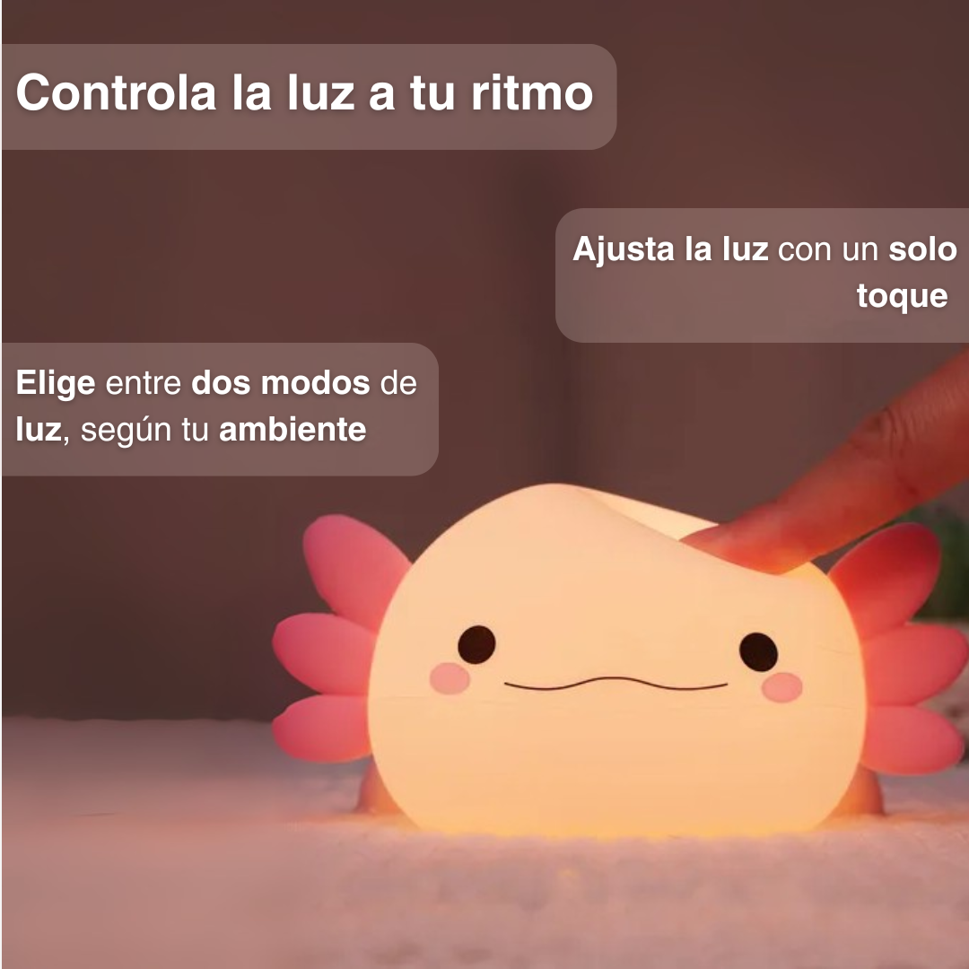 Crea el ambiente perfecto para dormir, leer o relajarte. Su tecnología LED de bajo consumo emite una luz cálida y suave que no molesta la vista. Pura calma en forma de ajolote.